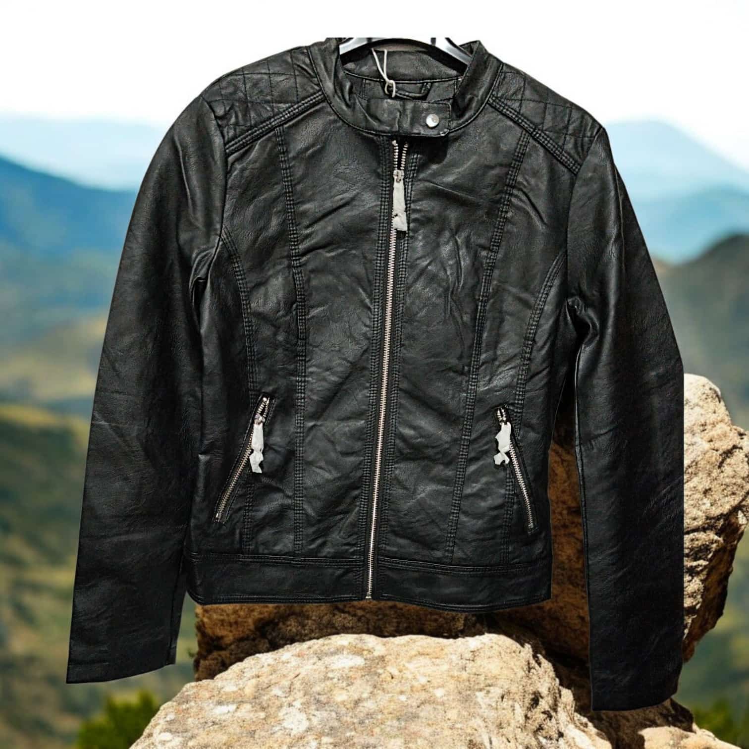 Chaqueta de cuero negra estilo biker, con cierre de cremallera, bolsillos laterales y cuello alto con broche. Su diseño moderno y urbano ofrece comodidad, durabilidad y un toque sofisticado para cualquier look.